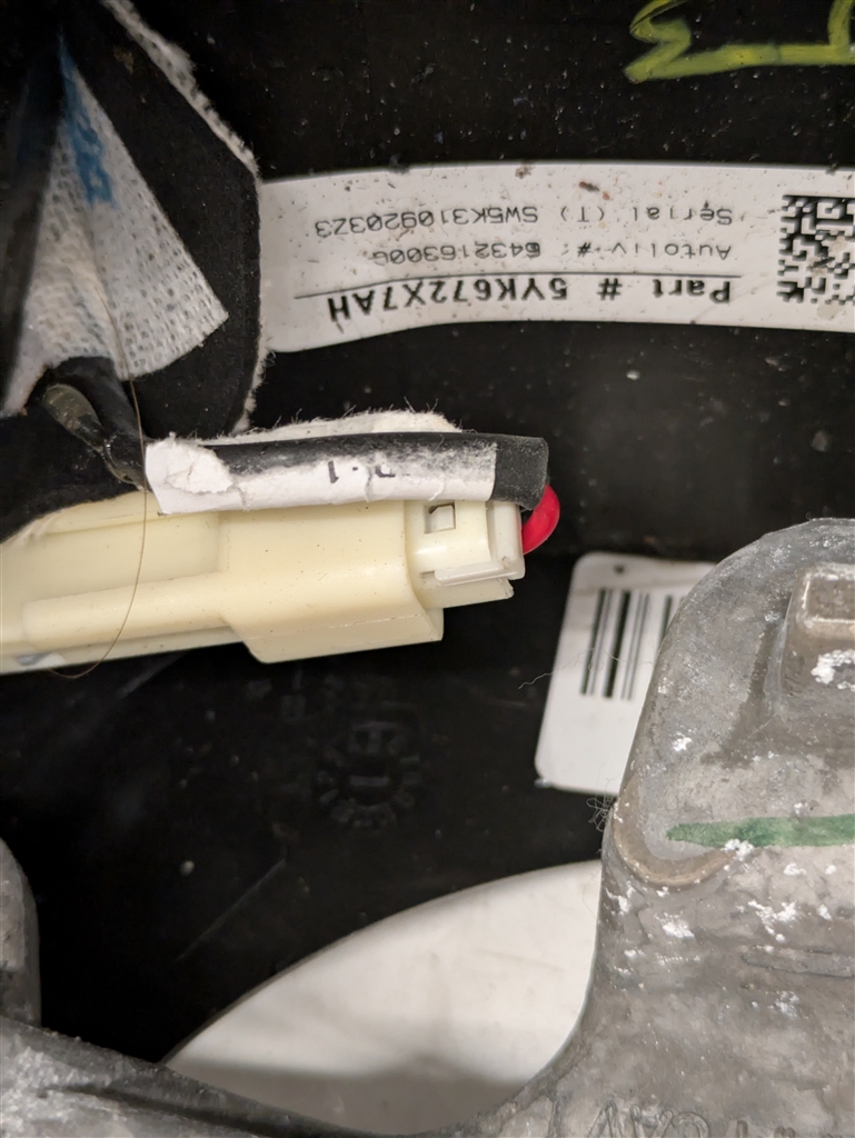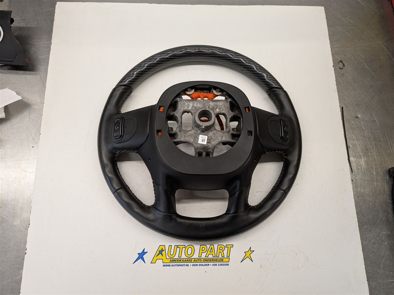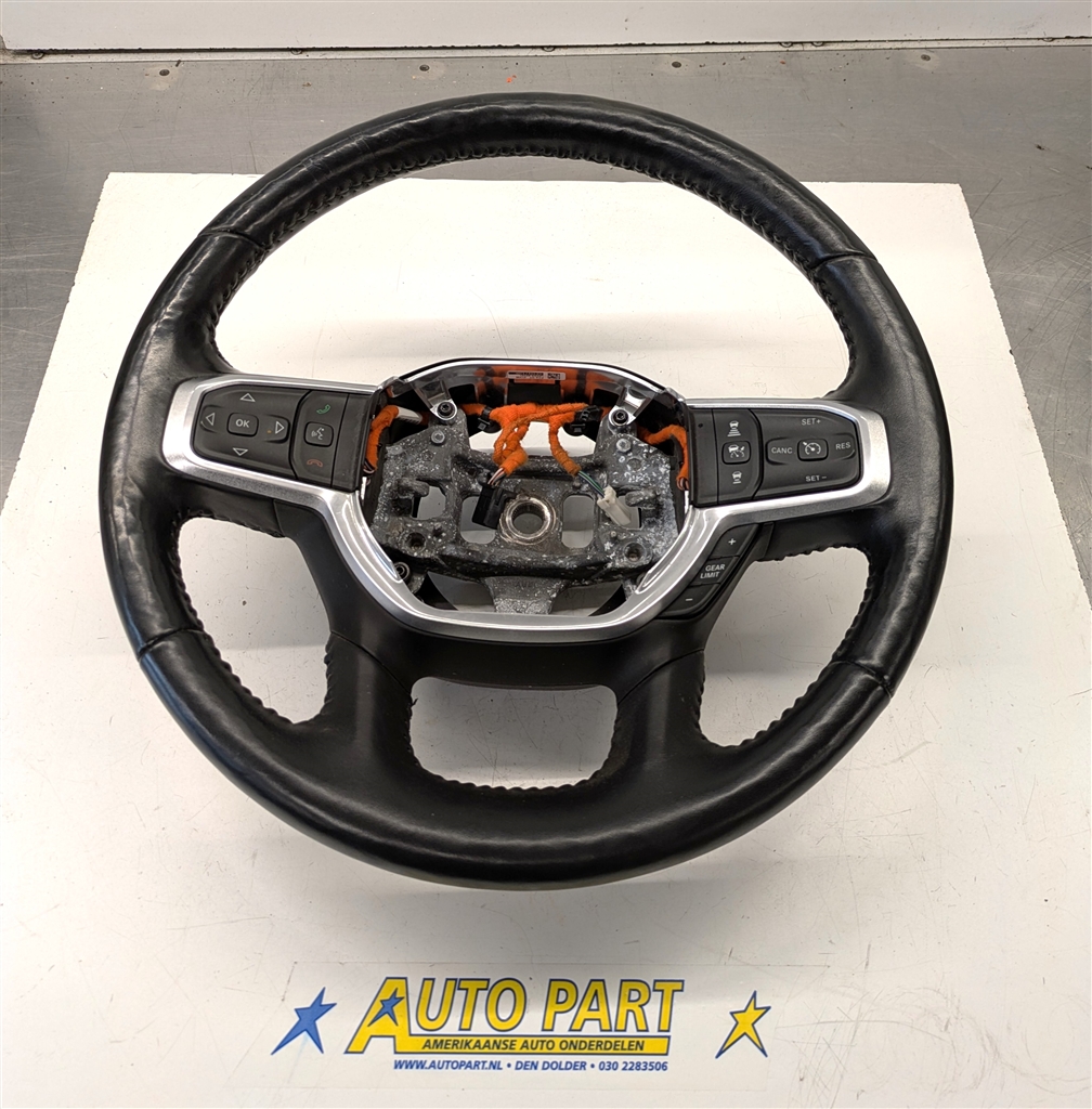 Een gebruikt origineel leren stuurwiel met Radio-, Voice Command-, Adaptive Cruise Control-, Info Center bediening en stuurverwarming van een Dodge Ram pickup 2019-2021.