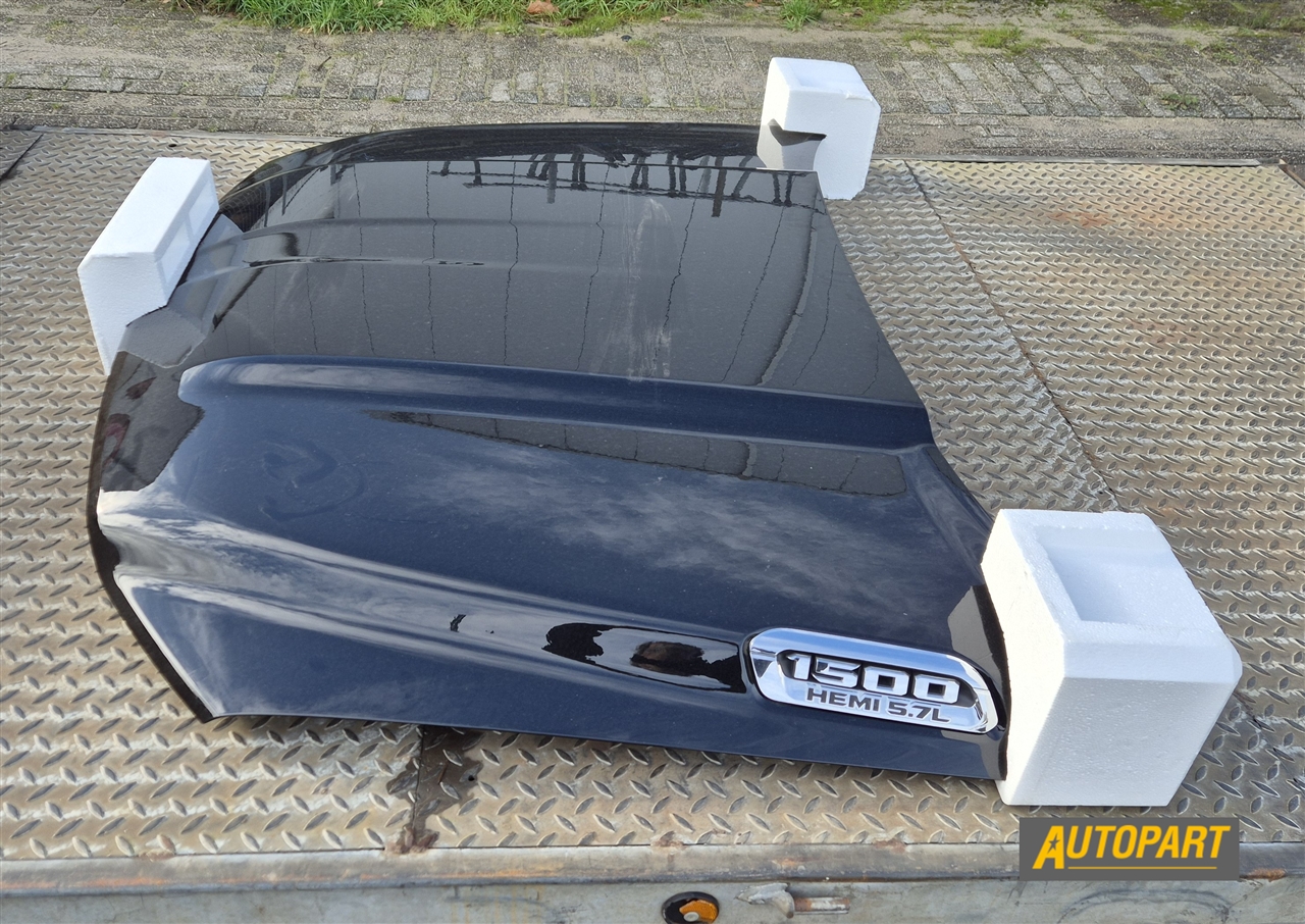 Een gebruikte originele standaard (zonder scoop) motorkap van een Dodge Ram 1500 pickup 2019-2025.