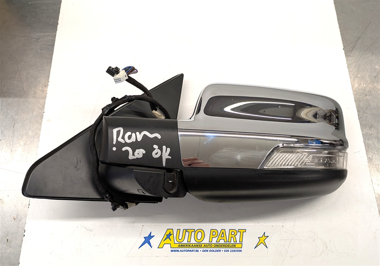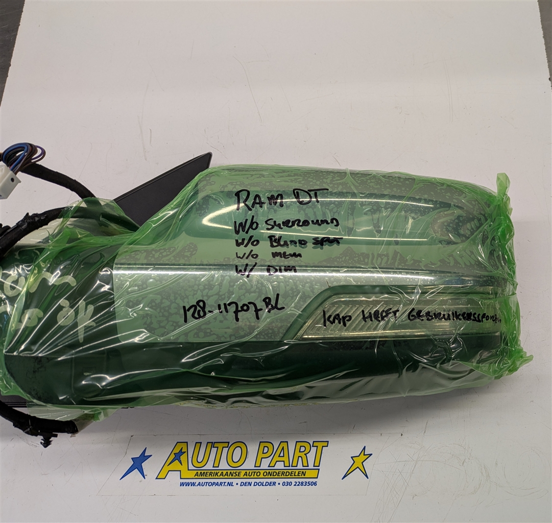 Een gebruikte originele linker buitenspiegel voor een Dodge Ram DT pickup 2019-2024.